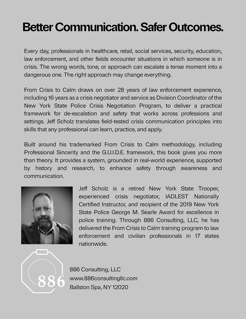 From Crisis to Calm® is built from nearly three decades in law enforcement and nearly 25 years with the New York State Police, including 16 years as a crisis negotiator and service as the Division Crisis Negotiation Coordinator. Communication wasn’t optional — it determined outcomes.